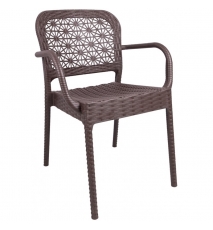 Sillón apilable, imitación a rattán, polipropileno marrón chocolate. Uso en exterior e interior.