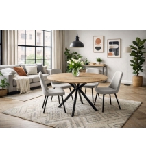 Mesa de diseño, armazón metálico con acabado negro, tapa de DM bilaminada con acabado roble claro