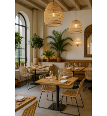 Silla de diseño, base de metal con acabado pintura epoxi de color negro mate, asiento y respaldo de ratán sintético de color beige. Uso en interior y exteriores protegidos. Taburete a juego.