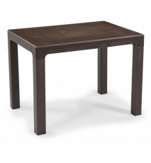 Mesa de diseño, imitación a rattán, polipropileno de color marrón chocolate, 150 x 90 cms. Otros colores y medidas disponibles. Silla y sillón a juego