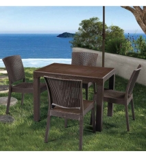 Mesa de diseño, imitación a rattán, polipropileno de color chocolate. Otros colores y medidas disponibles. Silla y sillón a juego