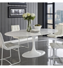 Mesa de diseño ovalada, base de fibra de vidrio, tapa de mármol carrara blanco de 180 x 108 cms. Sillas y sillones a juego