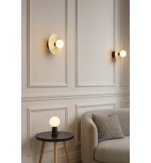 Este aplique de pared cuenta con una estructura metálica con acabado dorado y negro, y una tulipa fabricada en cristal color blanco, moderna y actual.