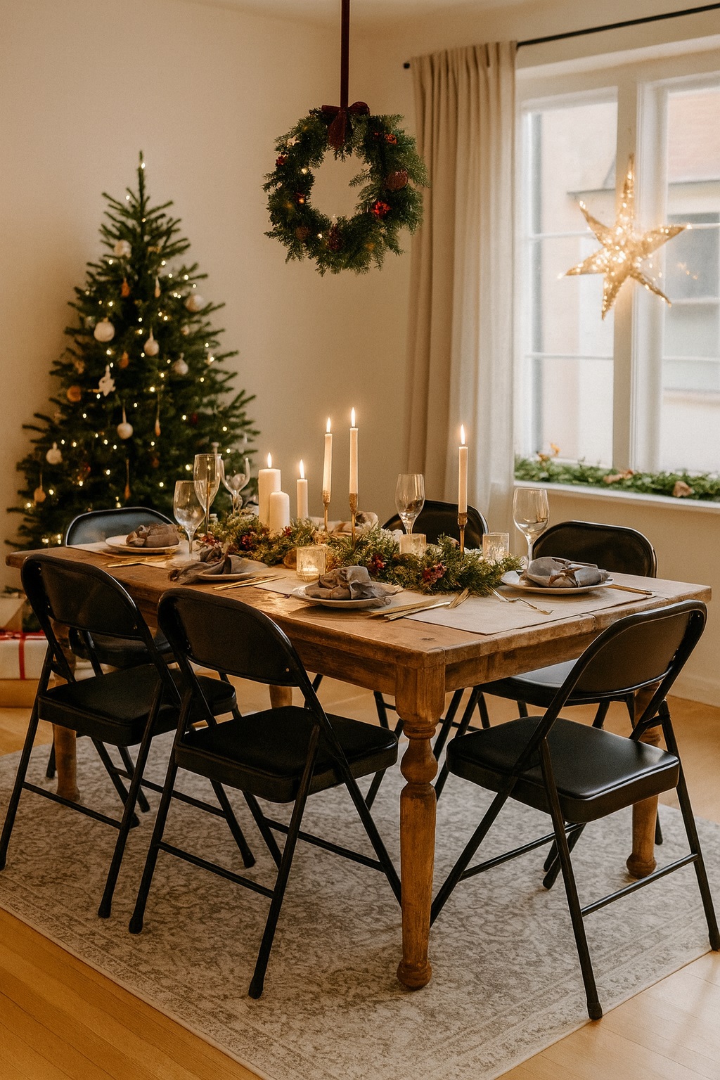 Las sillas plegables son una opción práctica y elegante. Puedes guardarlas fácilmente y sacarlas únicamente cuando llegan invitados extra. Hoy en día, muchas de estas sillas están diseñadas con materiales y acabados que combinan con el resto del mobiliario, evitando que parezcan un añadido improvisado. También existen modelos acolchados que aportan confort durante largas cenas navideñas.