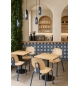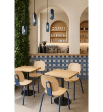 Silla de diseño, multiusos, apilable, armazón tubular con acabado azul, asiento y respaldo de contrachapado revestido con HPL con acabado natural. Taburete y mesas a juego.
