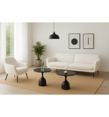 Mesa baja, diseño, armazón metálico con acabado negro, tapa de cerámica imitando a mármol negro, 50 cms de diámetro. Altura 61 cms. Otros colores disponibles