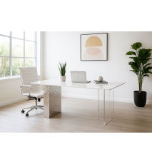 Mesa de comedor, base de acero inoxidable y acrílica, tapa de cerámica con acabado mármol blanco mate