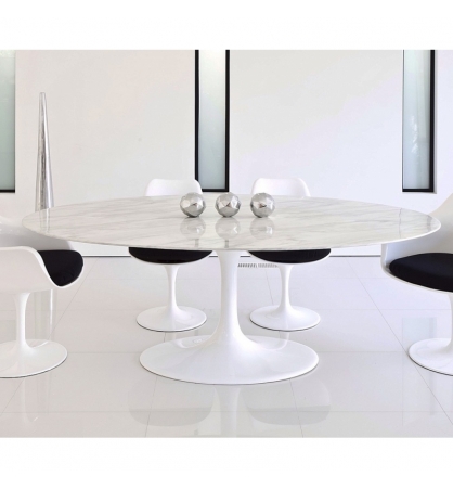 Mesa de diseño ovalada, base de fibra de vidrio, tapa de mármol carrara blanco de 180 x 108 cms. Sillas y sillones a juego