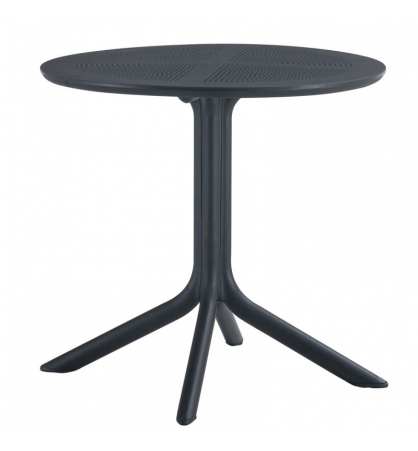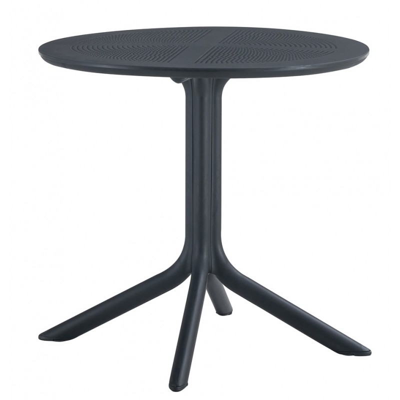 Mesa de diseño, polipropileno de color negro, 80 cms de diámetro. Otros colores disponibles. Silla y sillón con el mismo acabado
