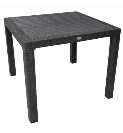 Mesa de diseño, imitación a rattán, polipropileno de color antracita, 90 x 90 cms. Otros colores y medidas disponibles. Silla y sillón a juego