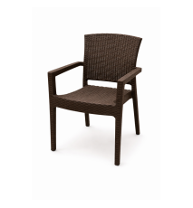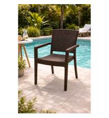 Mesa de diseño, imitación a rattán, polipropileno de color marrón chocolate, 90 x 90 cms. Otros colores y medidas disponibles. Silla y sillón a juego