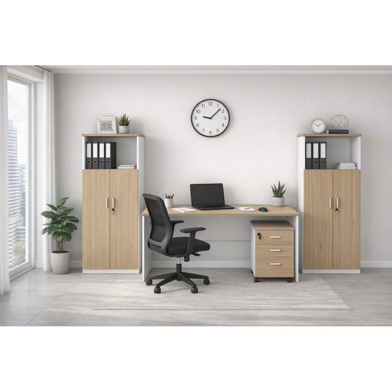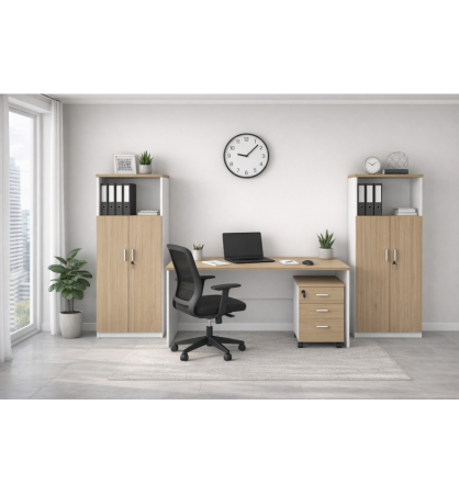 Mesa de oficina, bilaminado blanco y roble