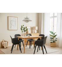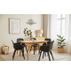 Mesa de diseño, armazón de madera de hevea con tapa chapada, acabado natural. Sillas y sillones a juego
