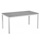 Mesa moderna, armazón de metal acabado epoxi blanco, tapa de polywood de 160 x 90 cms. de color gris. Uso en exteriores e interiores. Sillones a juego