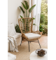 Sillón de diseño, base de metal con acabado pintura epoxi de color negro mate, asiento y respaldo de ratán sintético de color beige. Cojín en el asiento de color blanco. Uso en interior y exteriores protegidos.