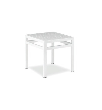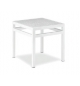 Mesa baja auxiliar, ideal para tumbona, armazón de aluminio endurecido y plastificado, con tapa de aluminio troquelado y plastificada, color blanco. Apilable.