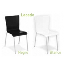 Silla de hostelería, armazón tubo de acero color negro o blanco, asiento y respaldo de madera de haya contrachapada y barnizada color a elegir. Apilable.