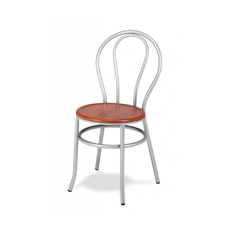 Silla de hostelería, armazón de tubo de acero en terminación epoxi negro o blanco, asiento en madera barnizada, color a elegir. Vea carta de colores. Apilable.