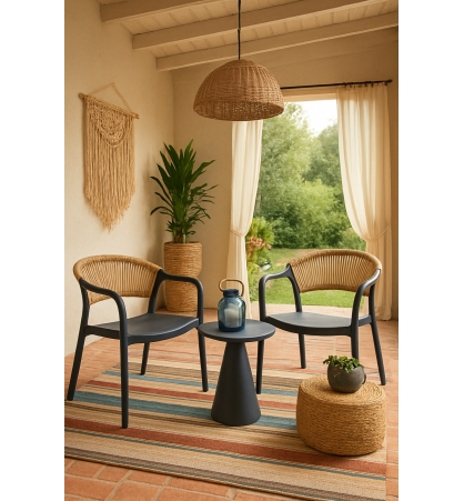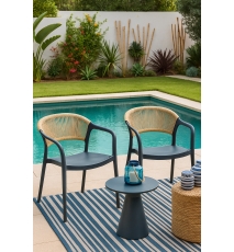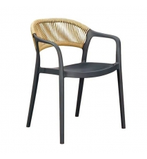 Sillón apilable, tratamiento anti UV, polipropileno gris oscuro, respaldo en cuerda de color natural, uso en exterior e interior. Otros colores disponibles.