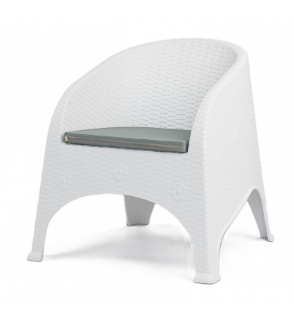 Sillón apilable, imitación a rattán, polipropileno blanco, cojín gris. Uso en exterior e interior. Otros colores disponibles.