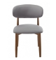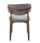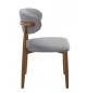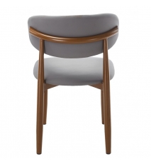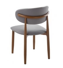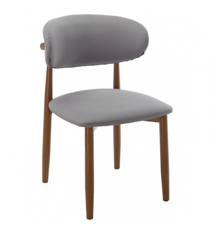 Silla de diseño, armazón metálico con acabado epoxi de color madera, asiento y respaldo tapizados en similpiel gris.