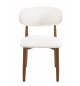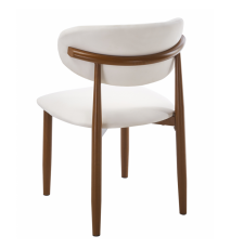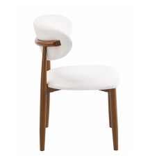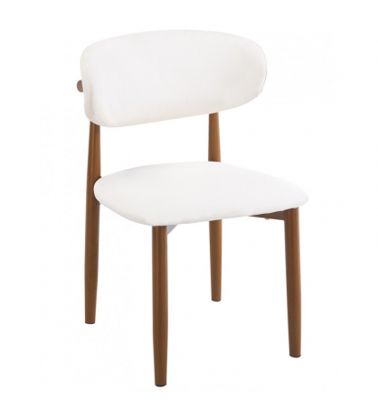 Silla de diseño, armazón metálico con acabado epoxi de color madera, asiento y respaldo tapizados en similpiel blanca.