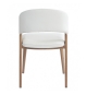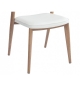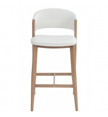 Silla de diseño, armazón metálico con acabado epoxi de color madera, asiento y respaldo tapizados en similpiel blanca. Taburete a juego