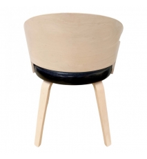 Sillón de diseño, multiusos, contrachapado de madera de hevea, barnizado natural, asiento tapizado similpiel negra. Taburete a juego con el mismo tapizado y acabado