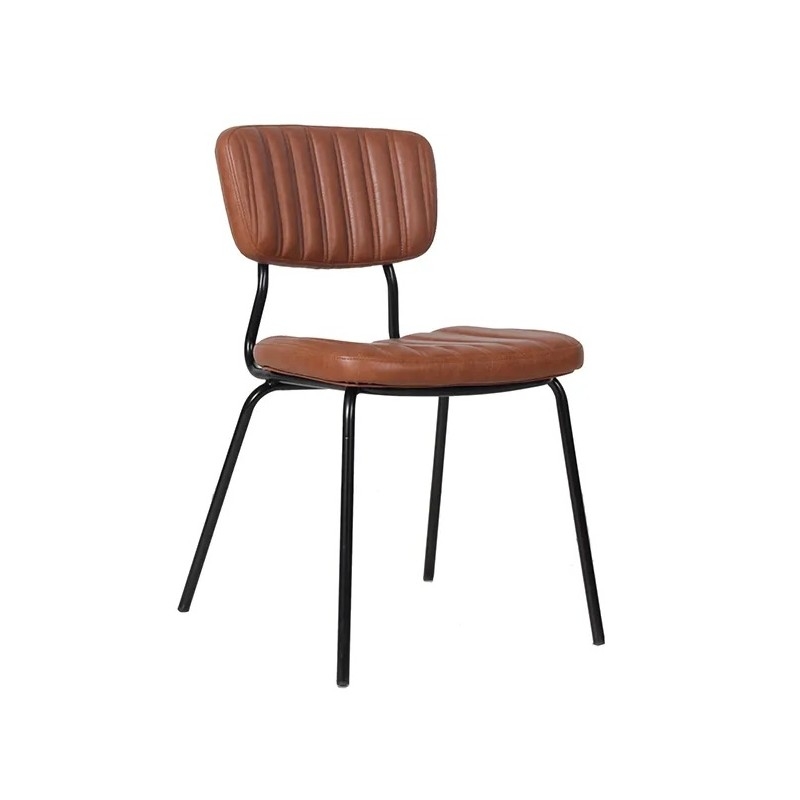 Silla de diseño, armazón metálico con acabado epoxi negro, asiento y respaldo tapizados en similpiel marrón. Taburete a juego