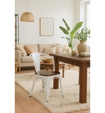 -Acabado en pintura epoxi de color blanco con asiento de madera maciza de pino. Con tratamiento previo de fosfatado.