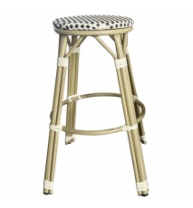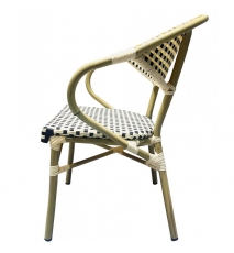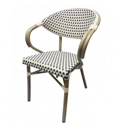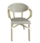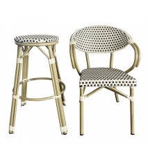 Sillón de diseño, aluminio, asiento y respaldo en ratán beige y marrón. Uso en exterior e interior. Otros colores disponibles. Taburete a juego
