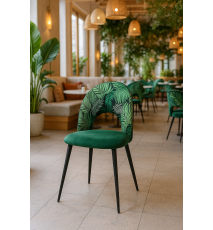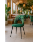 Silla de diseño, armazón metálico con acabado epoxi negro, asiento tapizados en terciopelo verde, respaldo en tejido decorado floral a juego. Otros colores disponibles. Taburete a juego