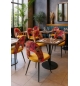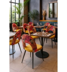 Silla de diseño, armazón metálico con acabado epoxi negro, asiento tapizados en terciopelo amarillo, respaldo en tejido decorado floral a juego. Otros colores disponibles. Taburete a juego