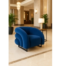 Sillón de diseño, tapizado en tejido velvet de color azul. Otros colores disponibles.